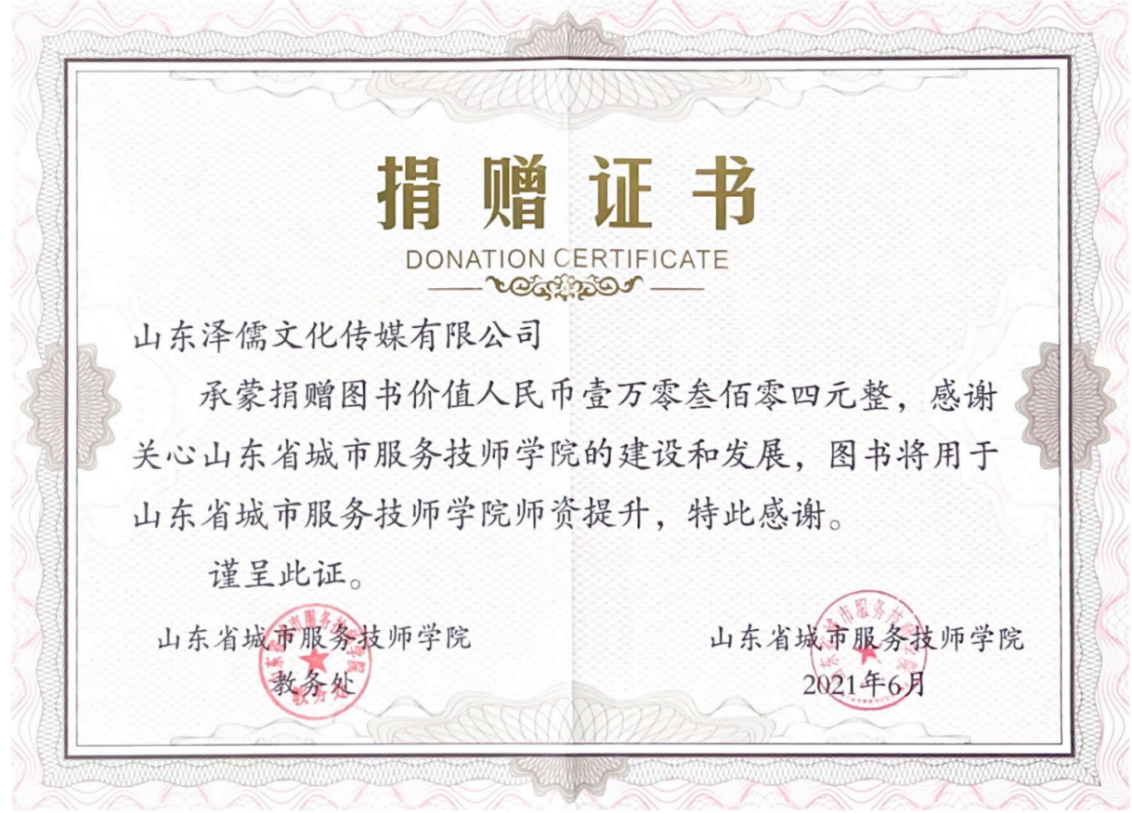为更好地支持学校教育事业的发展,弘扬公益精神,山东泽儒文化传媒有限公司通过山东省城市服务技师学院向山东省城市服务技师学院教务处捐赠价值人民币壹万零叁佰零四元整(¥10304.00元)的图书,用于学院师资提升、教务党支部图书角的建立等。